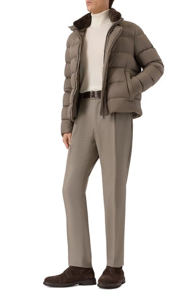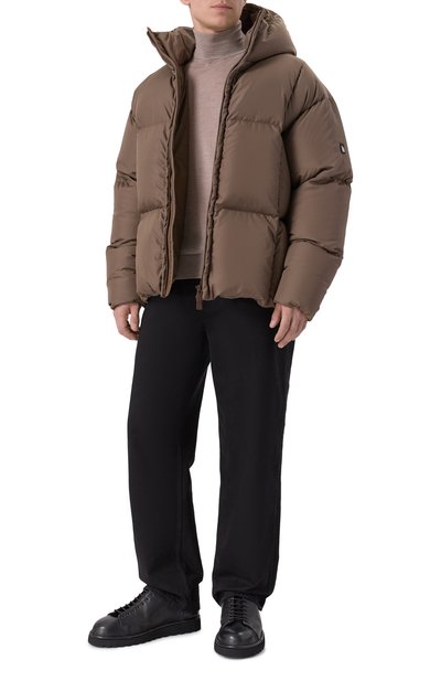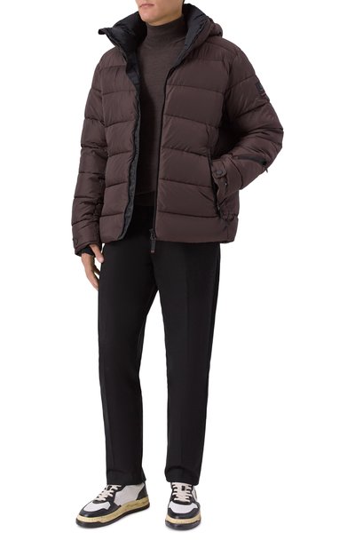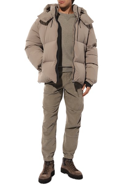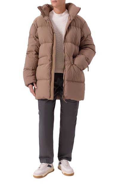 Стеганую куртку на гусином пуху выполнили из влагоотталкивающей нейлоновой микрофибры Ecoage с полиуретановым покрытием. Модель с боковыми карманами и съемным регулируемым капюшоном застегивается встречной молнией.