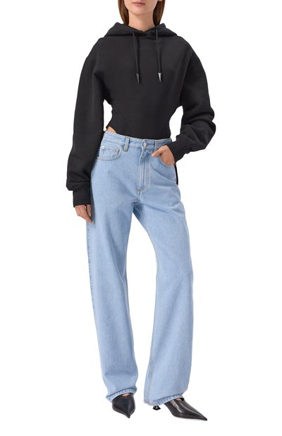 Боди с длинными рукавами выполнили из стрейчевого вискозного трикотажа с бархатистой фактурой. Модель с экстремально глубоким V-образным вырезом и акцентированными плечами дополнили капюшоном.