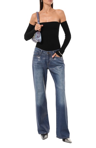 Боди с длинными рукавами выполнили из стрейчевого вискозного трикотажа с бархатистой фактурой. Модель с экстремально глубоким V-образным вырезом и акцентированными пл ечами дополнили капюшоном.