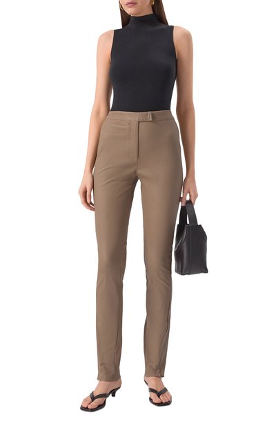 Легинсы с рельефными вертикальными швами выполнили из стрейчевого текстиля на основе вторичного полиамида. Модель с высокой посадкой дополнили эластичными штрипками в тон.