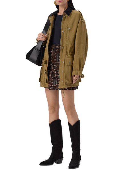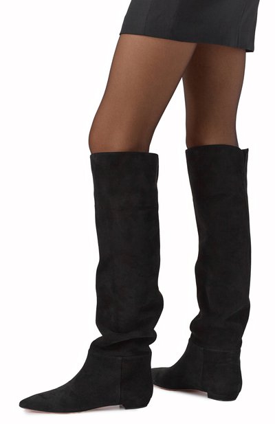 Сапоги Jackie New с квадратным мысом выполнили из цельного куска замши, обтянув ею же высокий блочный каблук Sophia. Единственный шов на модели сзади скрыли узким ремешком, дополненным пряжкой-монограммой DG.
