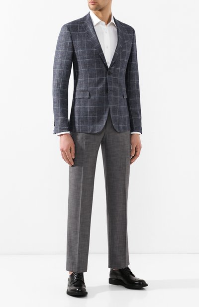 Брюки с классической посадкой, защипами и стрелками сшили из микса хлопка и кашемира с узором пье-де-пуль. Модель прямого кроя дополнили открытыми боковыми карманами и задними на пуговицах.