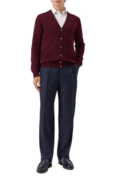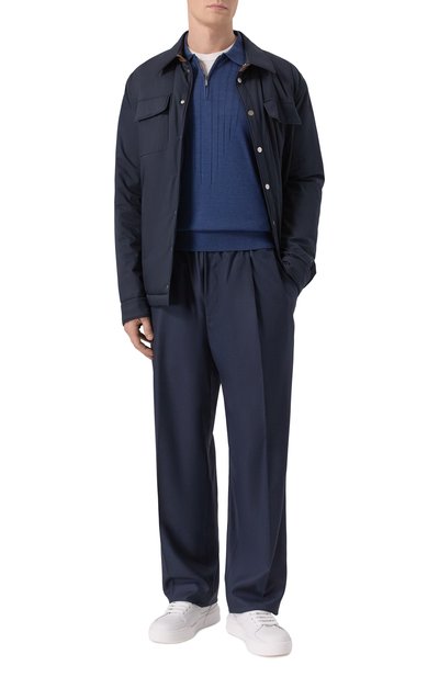 Брюки с классической посадкой, защипами и стрелками сшили из микса хлопка и кашемира с узором пье-де-пуль. Модель прямого кроя дополнили открытыми боковыми карманами и задними на пуговицах.