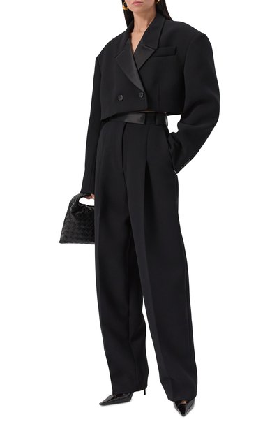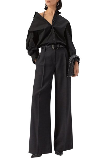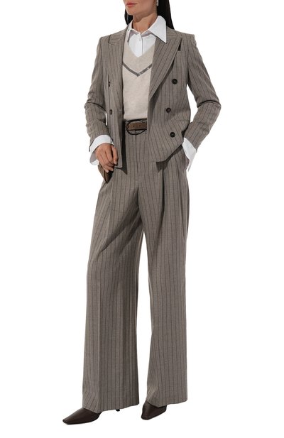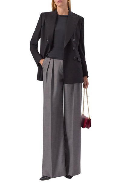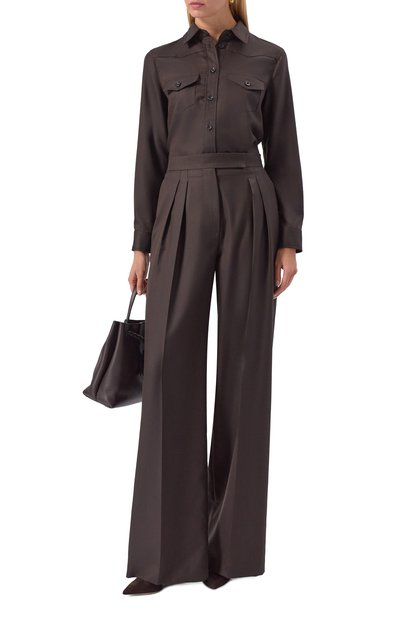Брюки с двойными защипами и отглаженными стрелками сшили из кашемира. Модель дополнили боковыми и задними прорезными карманами.