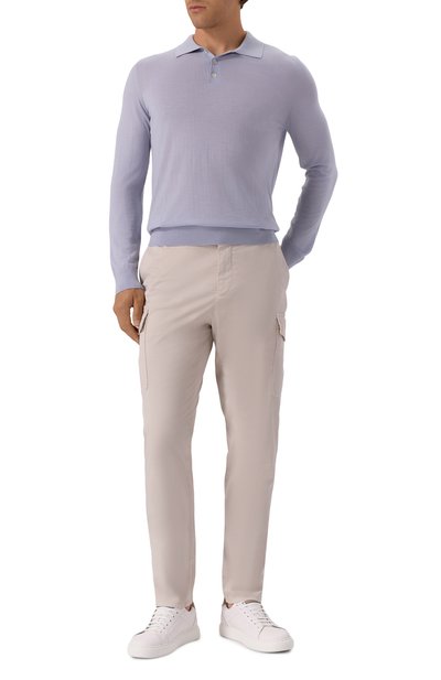 Для создания поло с V-образным вырезом выбрали тонкий шерстяной трикотаж. Модель с эластичными манжетами и поясом органично дополнит непринужденный повседневный образ.