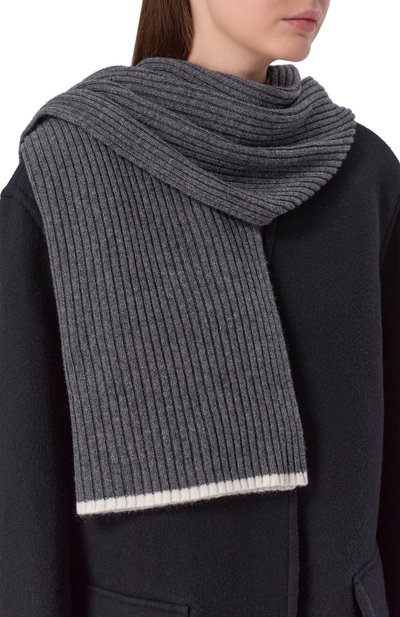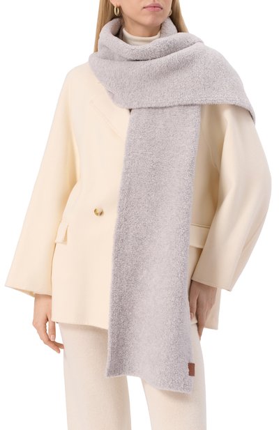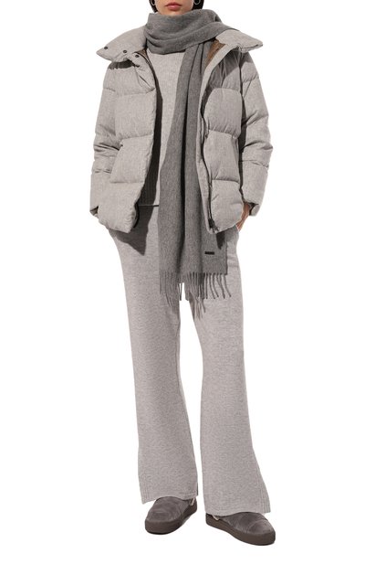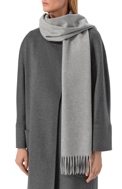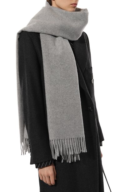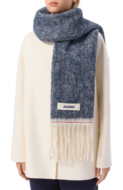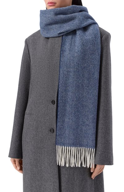 Шарф с меланжевым шевронным мотивом выполнили из чистой шерсти. Модель с тонкой бахромой по краям украсили логотипом марки, вышитым в тон.