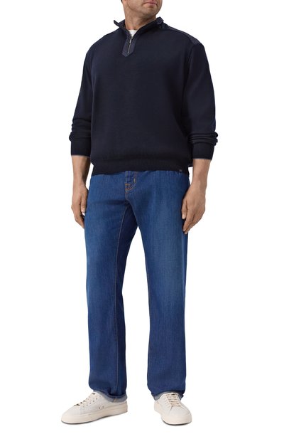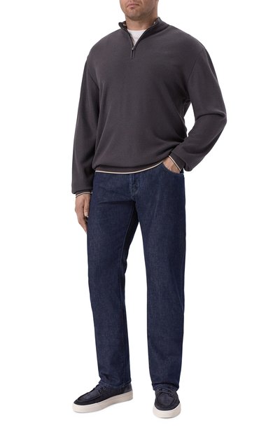 Джемпер с отделкой в рубчик связали фактурным микроузором из пряжи на основе шерсти и лиоцелла. Модель с молнией спереди декорировали полосатым кантом на манжетах, поясе и внутренней стороне воротника-стойки.