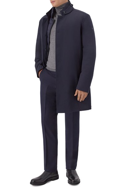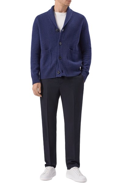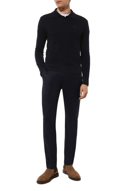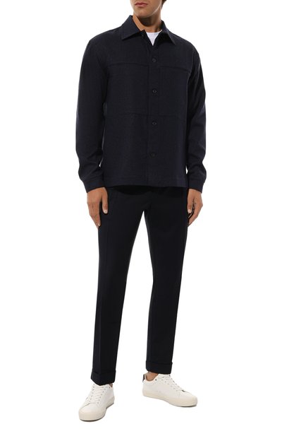 Брюки с проглаженными стрелками и эластичным поясом-кулиской выполнили из стрейчевой шерсти. Помимо боковых карманов предусмотрели пару задних и карго с клапанами.
