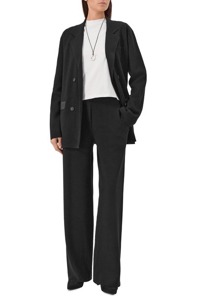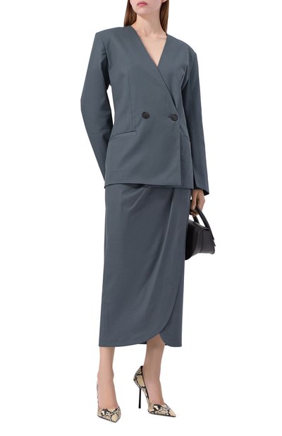 Двубортный жакет с широкими лацканами и одной шлицей выполнили из тонкой шерстяной ткани стрейч. Модель с нагрудным карманом и боковыми с клапанами дополнили узким поясом.
