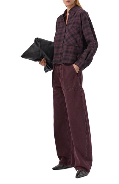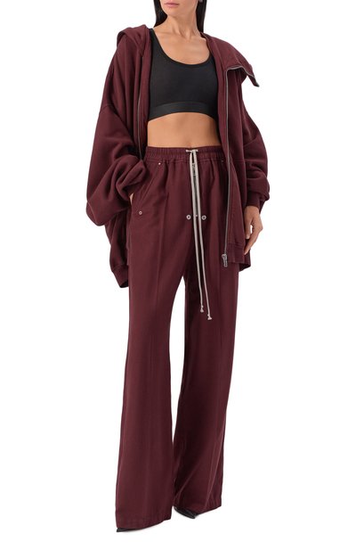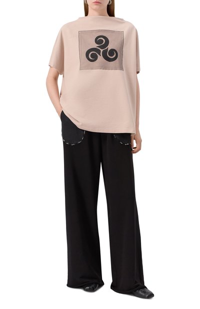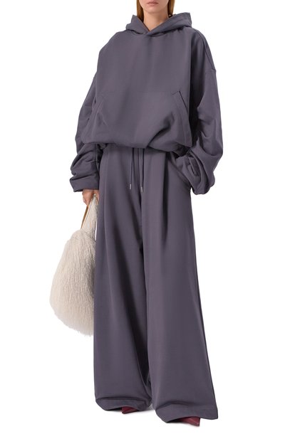Широкие расклешенные брюки с глубокими складками спереди выполнили из хлопкового трикотажа. Модель с регулируемым поясом-кулиской дополнили боковыми и задним карманами.