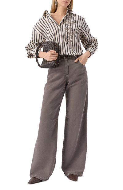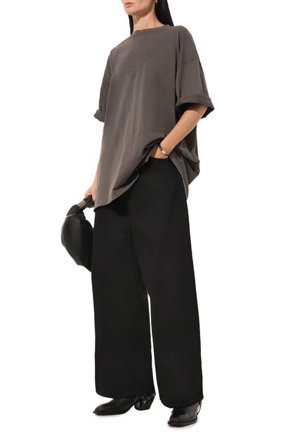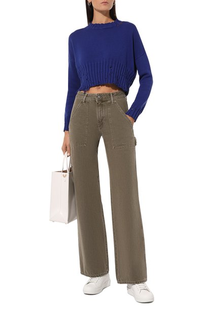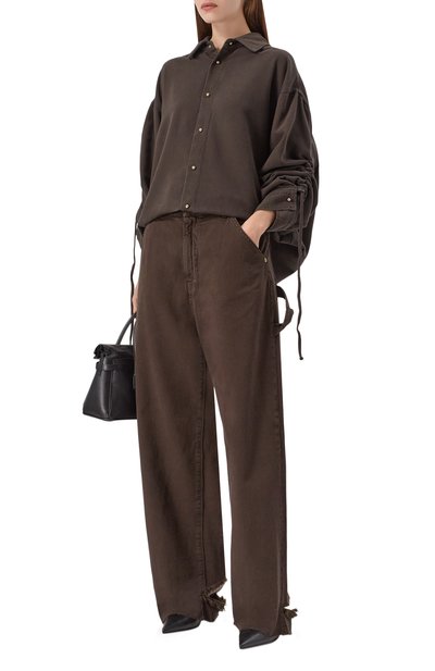 Джинсы со средней посадкой и широкими отворотами сшили из хлопкового денима с бархатистой изнанкой. Модель свободного кроя дополнили двумя врезными карманами по бокам и парой сзади.