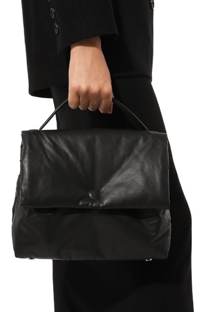 Сумку с жесткой ручкой из эпоксидной смолы и съемным регулируемым ремнем выполнили из глянцевой кожи с эффектом кракелюра. Аксессуар с накладным внутренним карманом и магнитной застежкой декорировали встречными складками спереди и сзади.