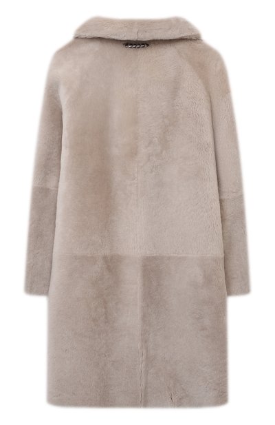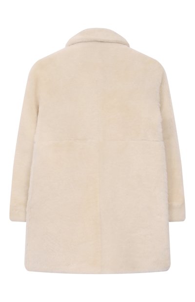Шубу с супатной застежкой выполнили из меха кролика. Модель на шелковом подкладе дополнили капюшоном и двумя прорезными карманами.