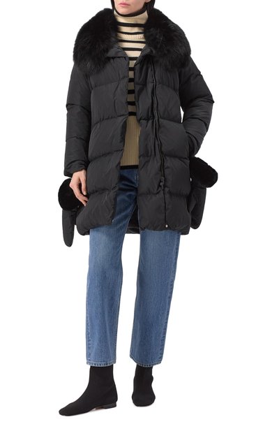 Укороченный пуховик с манжетами-митенками сшили из эластичного полиэстера с фирменным паттерном. Стеганую куртку на утином пуху дополнили врезными боковыми карманами и съемным воротником из меха песца.