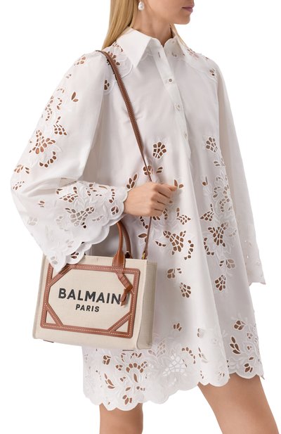 Сумку B-Army из хлопкового канваса с зебровым принтом дополнили двумя ручками, съемным плечевым ремнем и брендированным патчем из телячьей кожи. Внутри аксессуара с застежкой на карабин предусмотрели плоский карман.