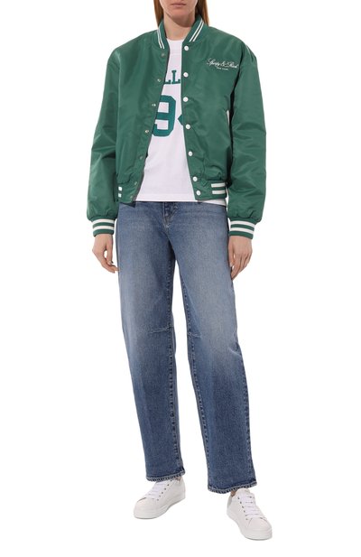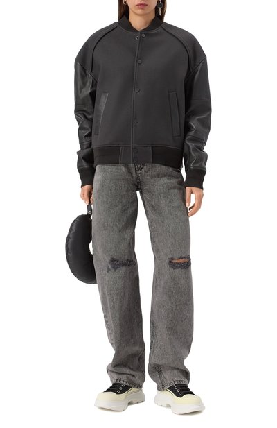 Бомбер Homerun с рифлеными полосатыми манжетами, поясом и воротом выполнили из итальянской шерсти двух оттенков. Куртку с двумя карманами украсили вышитыми фирменным логотипом и эмблемой бейсбольной команды New York Yankees.