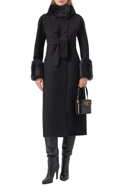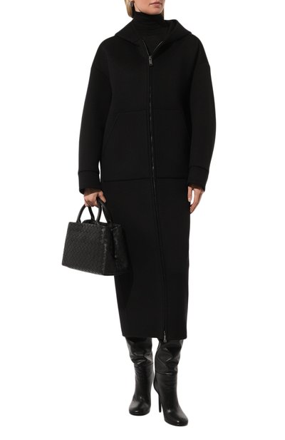 Пальто с мягкой линией плеч, широкими острыми лацканами и шлицей сзади выполнили из фактурного кашемира. Двубортная модель с боковыми карманами и нагрудной листочкой застегивается пуговицами в тон.