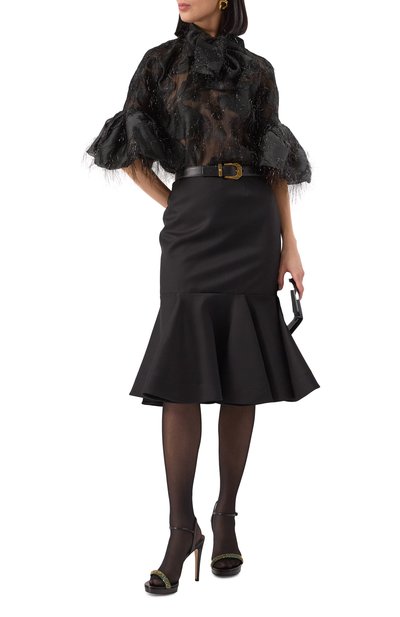 Босоножки Chandelle на высокой шпильке выполнили из атласа, укрепленного изнутри тонкой кожей. Модель с перекрещивающимися фигурными перемычками и узким ремешком с пряжкой сбоку украсили золотистой брендированной вставкой на стельке.
