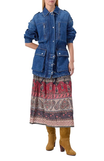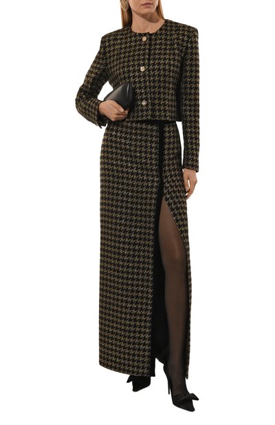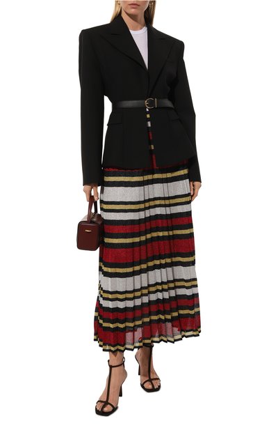 Плиссированную юбку выполнили на ткацком станке Caperdoni из смесовой пряжи с добавлением нитей ламе. Модель с фирменным зигзагообразным мотивом и полосками из пайеток дополнили крупными шлевками для ремня.