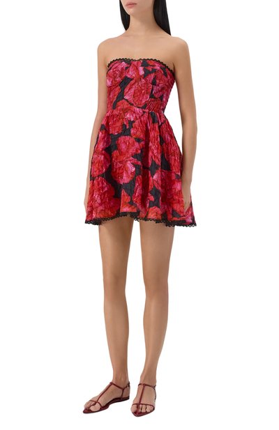 Короткое платье-бюстье Clem с ажурной вышивкой выполнили из ткани на основе хлопка и льна с добавлением полиэстера. Модель с эластичными гофрированными вставками на лифе и потайной молнией сбоку декорировали волнистой тесьмой.