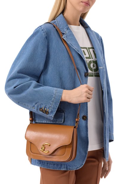 Сумку C-Me из крупнозернистой кожи украсили фирменной металлической литерой C. Под клапаном на магнитной кнопке разместили открытый карман, а еще один на молнии предусмотрели в основном отсеке. В комплекте – съемные ручка и регулируемый ремень.