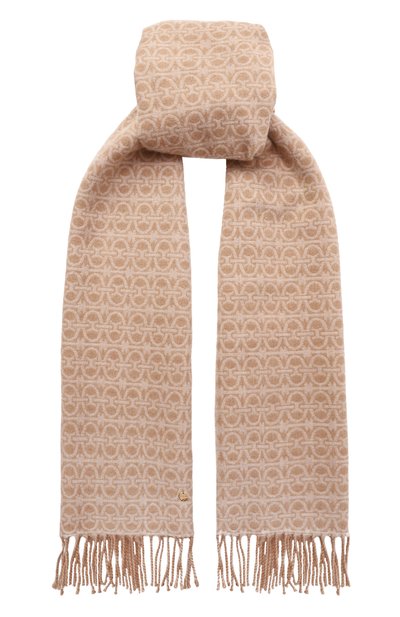 Шарф с жаккардовым паттерном Monogram выполнили из шерсти с добавлением акрила. Края аксессуара, дополненного брендированным медальоном, подчеркнули витой бахромой.