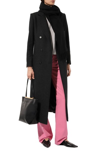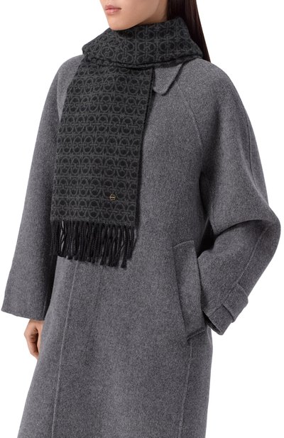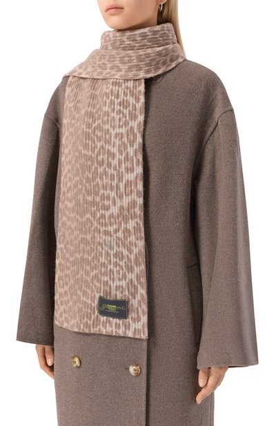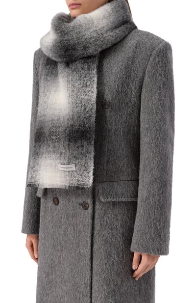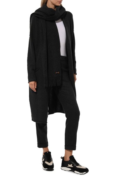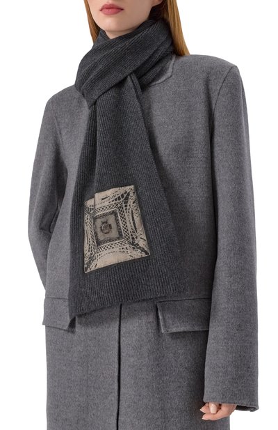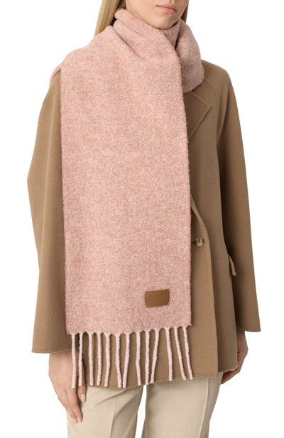 Шарф связали из акриловой пряжи с добавлением полиэстера и шерсти. Края модели с брендированной нашивкой украсили длинными контрастными кисточками.