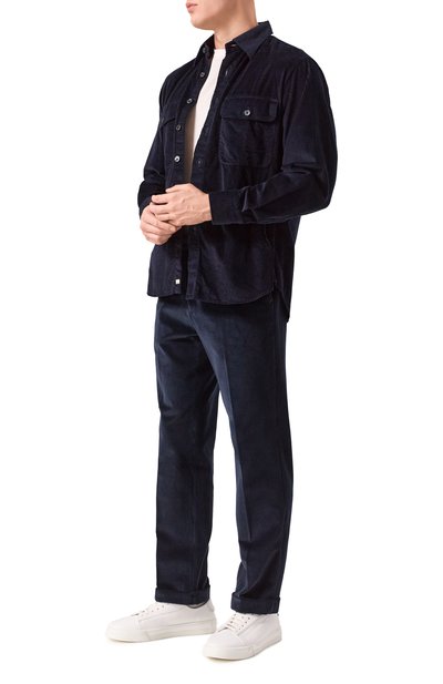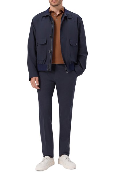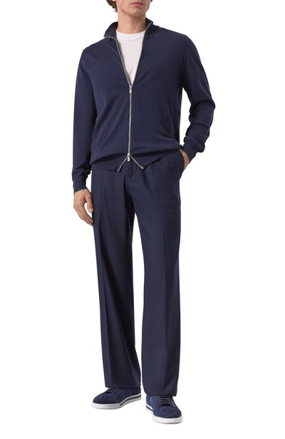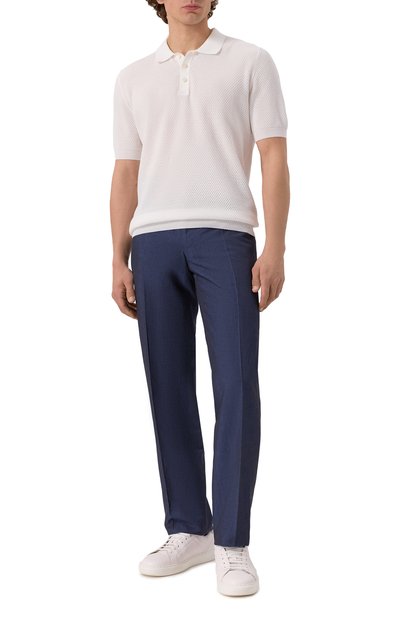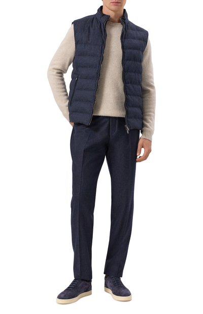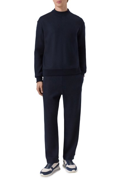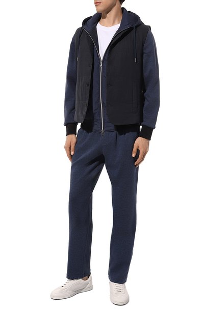 Зауженные брюки со стрелками выполнили из трикотажа на основе хлопка, кашемира и шелка. По бокам предусмотрели карманы, а пояс-кулиску дополнили эластичной вставкой сзади.