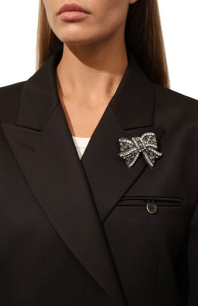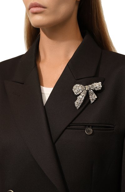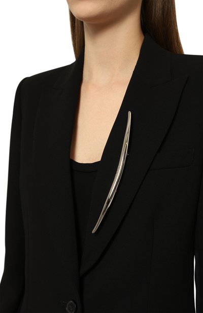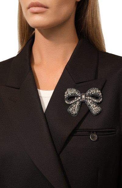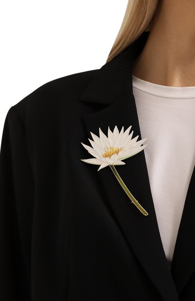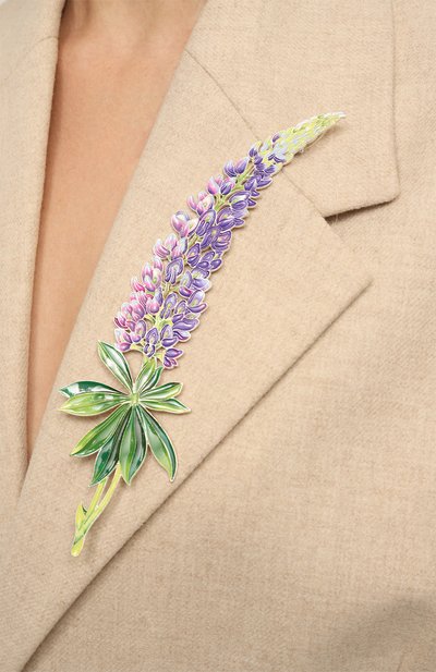 Крупную брошь с застежкой-булавкой изготовили из латуни с золотистым и серебристым финишем. Украшение с гроздью фигурных бусин дополнили хлопковыми шнурами и брендированной пластиной.