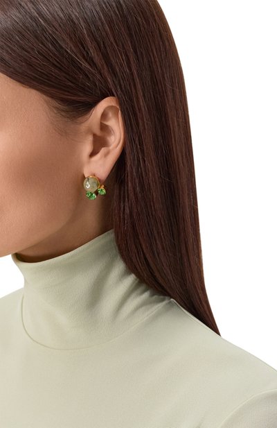 Серьги с застежкой-пусетой изготовили вручную из латуни с золотистым финишем. Асимметричный аксессуар украсили кристаллами и полудрагоценными камнями.