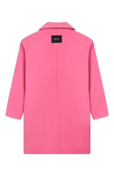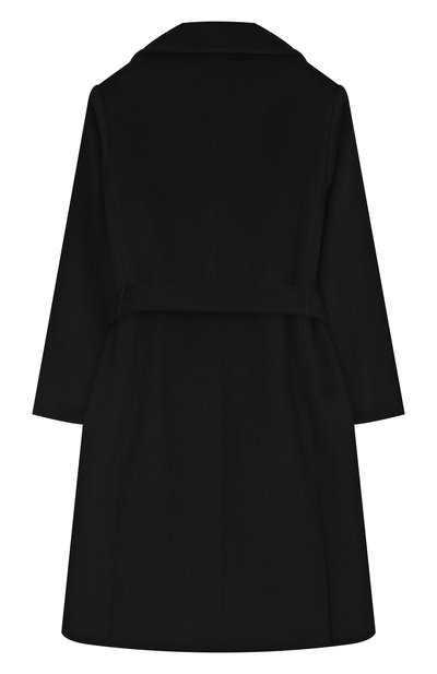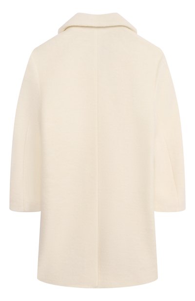 Двубортное пальто выполнили из напоминающего овчину буклированного текстиля. Модель с прямоугольными лацканами и патами на манжетах дополнили накладными карманами.