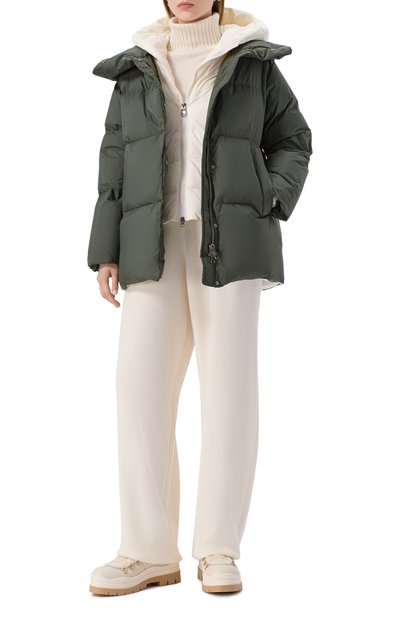 Стеганую куртку на утином пуху выполнили из полиэстера с добавлением нейлона. Спереди расположили брендированную нашивку в тон. Модель с патами на рукавах и съемным капюшоном застегивается встречной молнией.