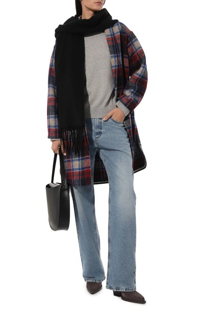 Для соз дания широкого шарфа выбрали микс вискозы, шерсти первого пострига и полиэстера с миниатюрными пайетками, нанизанными на нити. Края декорировали бахромой, а в одном из углов вышили логотип в тон.