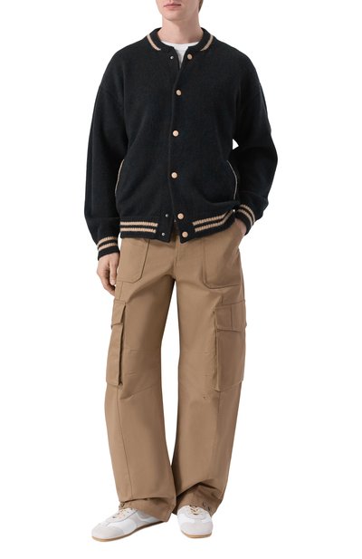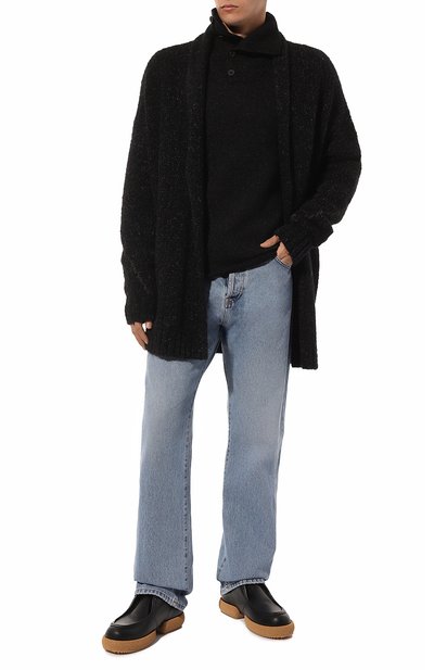 Oversize-кардиган с шалевым воротником связали из шерстяной пряжи с добавлением полиамида. Модель на брендированных пуговицах в тон дополнили накладными боковыми карманами.