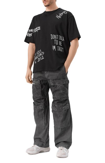 Футболку с круглым вырезом в рубчик и спущенной линией плеч выполнили из хлопкового джерси. Модель декорировали логотипом в стиле граффити спереди и брендированной нашивкой на рукаве.