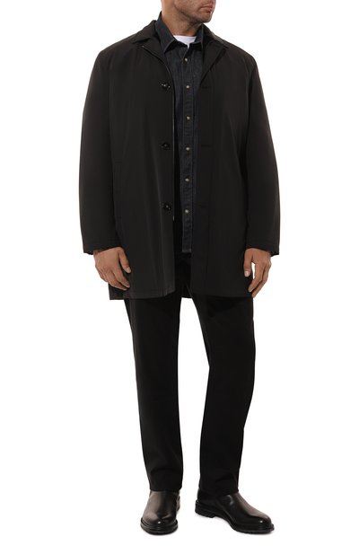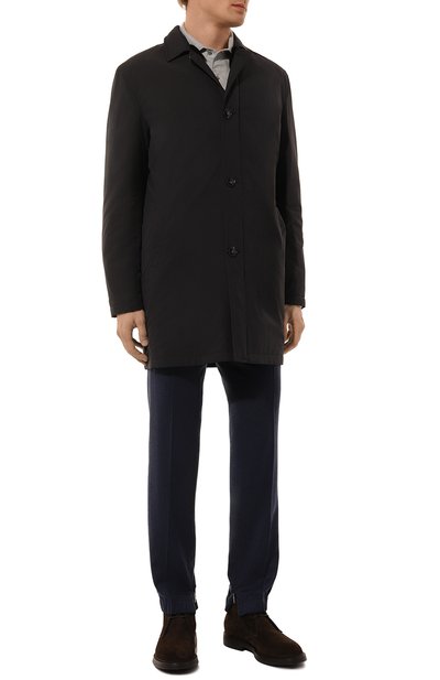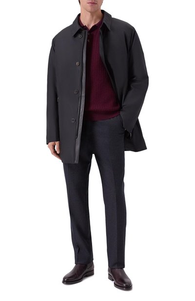 Плащ с регулируемыми разрезами на манжетах и штормовой планкой, скрывающей молнию и кожаную вставку, дополнили боковыми карманами. Модель со шлицей сзади выполнили из чистого шелка.
