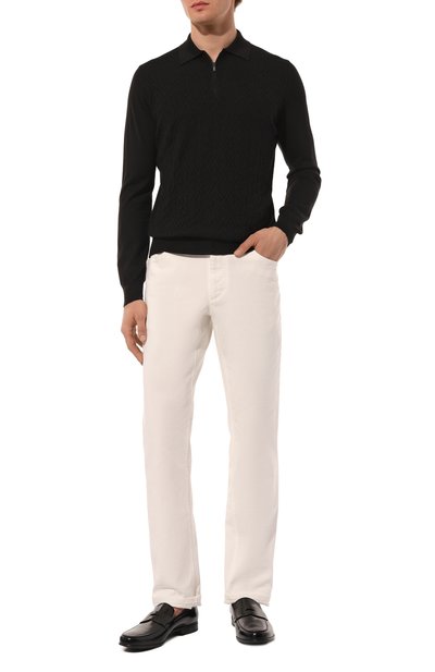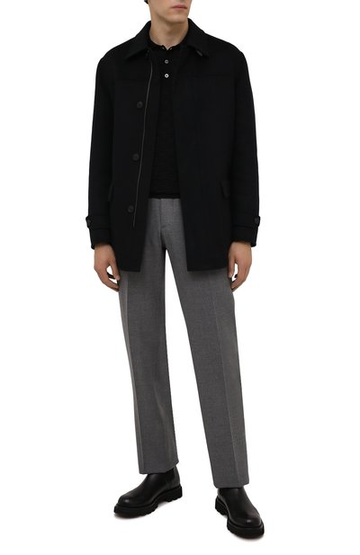 Поло с фактурным шевронным узором связали из микса шерсти, кашемира и шелка. Модель с поясом и манжетами в рубчик застегивается брендированными пуговицами.