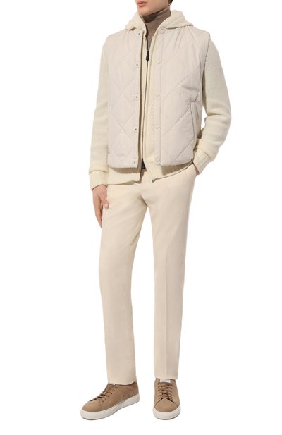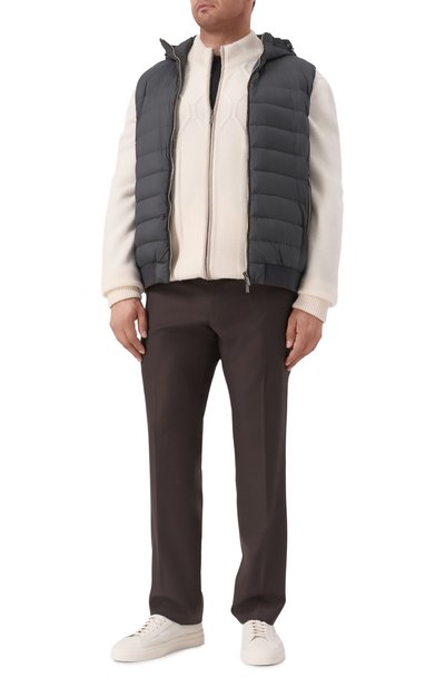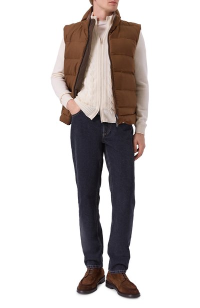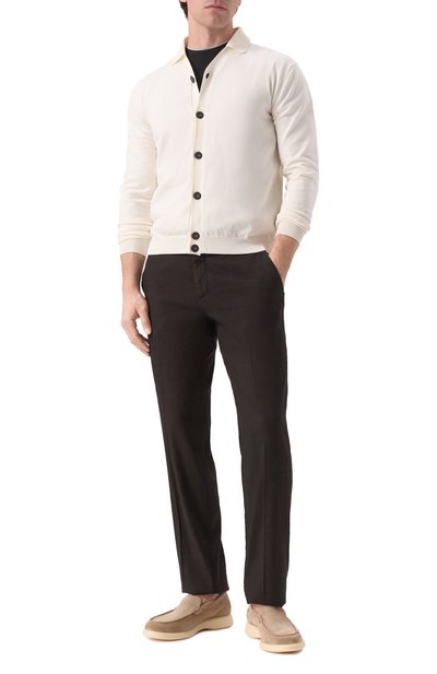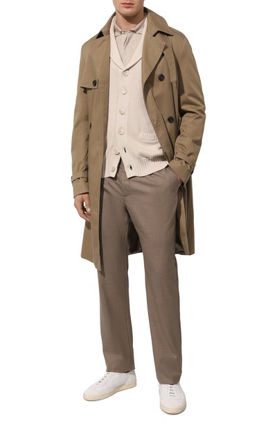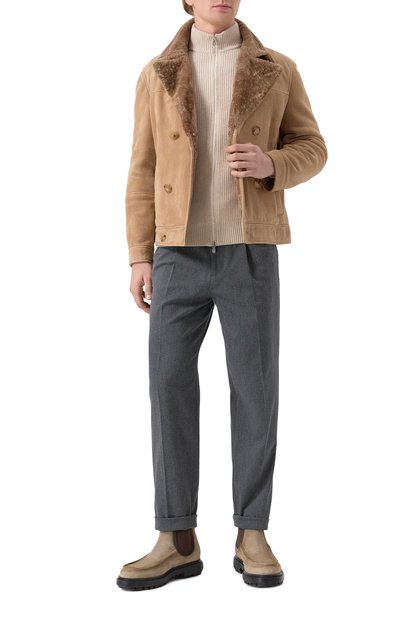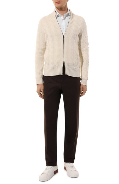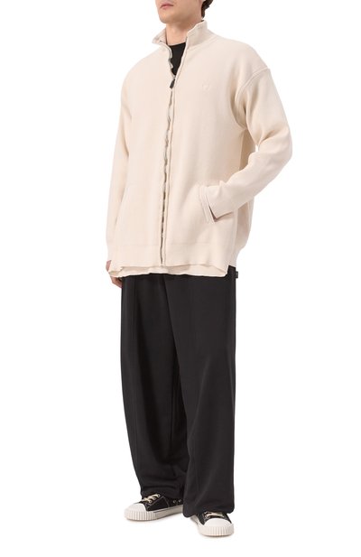 Кардиган с рифлеными манжетами, поясом и высоким воротом связали из чистого кашемира. Спереди модель с двумя карманами украсили фактурным узором и кожаными стичингом, а сзади – брендированной накладкой.