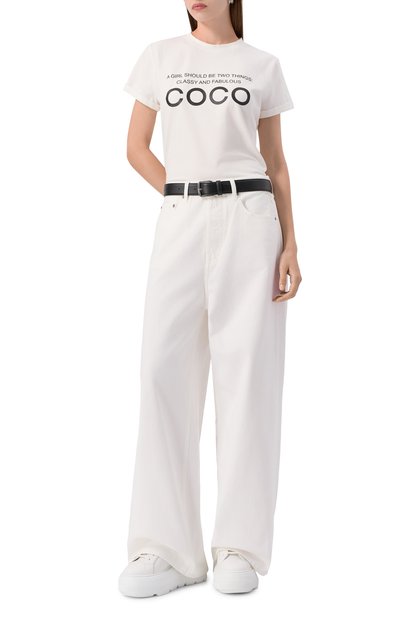 Для изготовления футболки Evi кроя Relaxed fit использов али чуть бархатистый на ощупь трикотаж из хлопка, выращенного методом регенеративного земледелия. Спереди модель декорировали выложенной стразами надписью The Party Has Arrived.