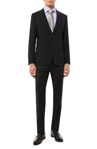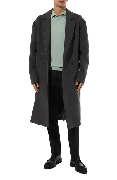 Брюки с защипами, переходящими в стрелки, выполнили из костюмной шерсти. Модель дополнили четырьмя карманами, а на поясе предусмотрели паты с брендированными пряжками.