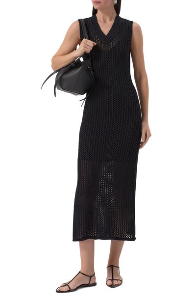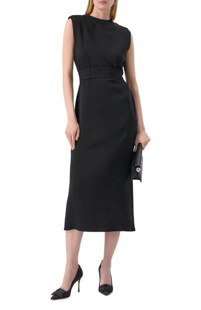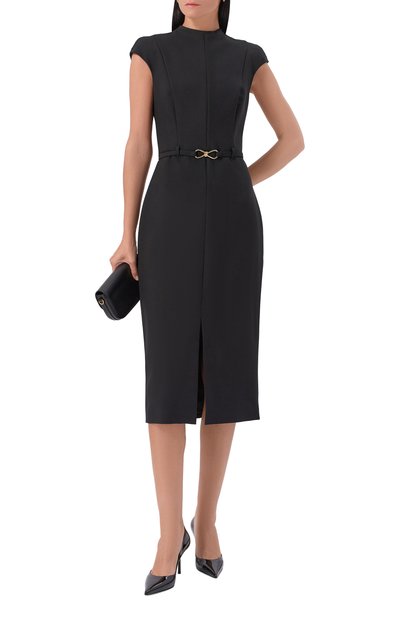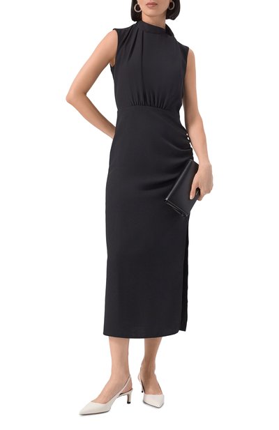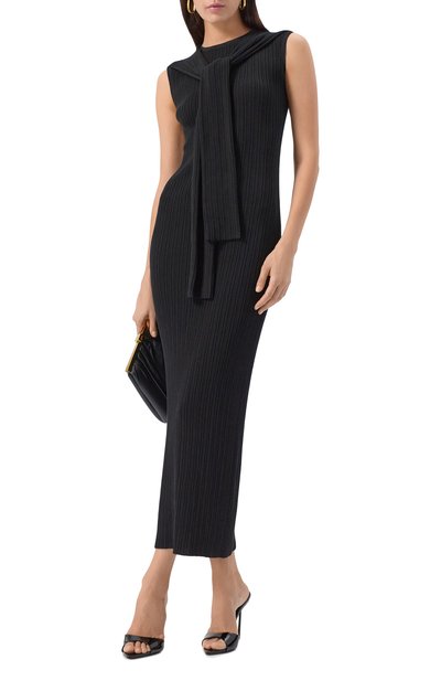 Миди-платье Katoni в мерцающую меловую полоску выполнили из смеси полиэстера и вискозы с добавлением эластана. Модель со шлицей спереди застегивается молнией с пуллером в виде логотипа сзади. В комплекте – пояс с объемным цветком, усыпанным стразами.