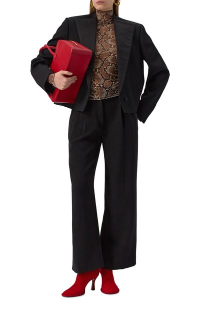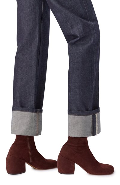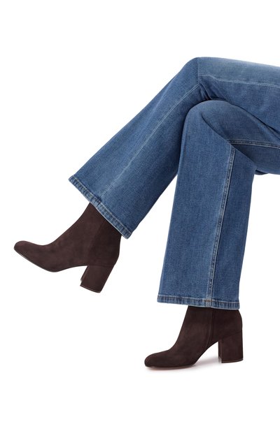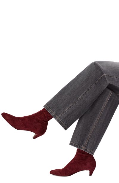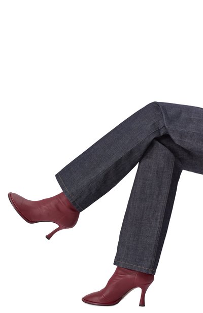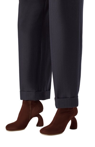 Ботильоны Jive 90 с миндалевидным мысом и фигурным каблуком сшили из замши. Модель с кожаным подкладом и эластичным голенищем установили на тонкую подошву с фирменным жемчужным кабошоном.