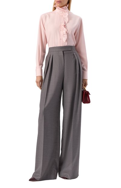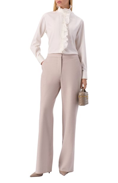Блузу с фигурным низом и закругленными манжетами выполнили из шелка. Воротник-стойку и планку с перламутровыми пуговицами подчеркнули узкой оборкой.