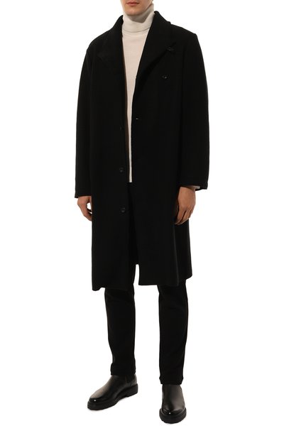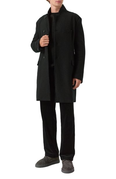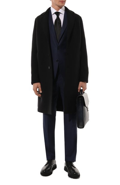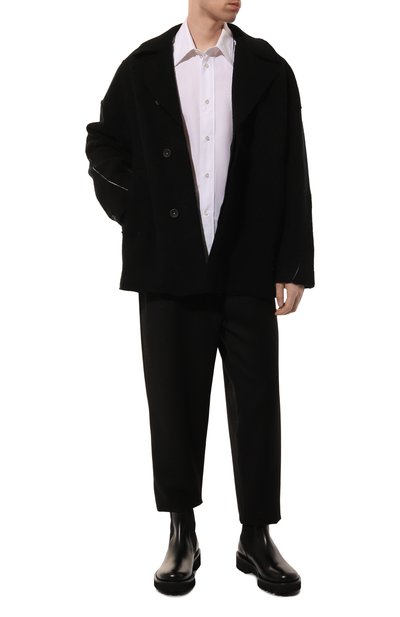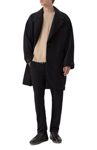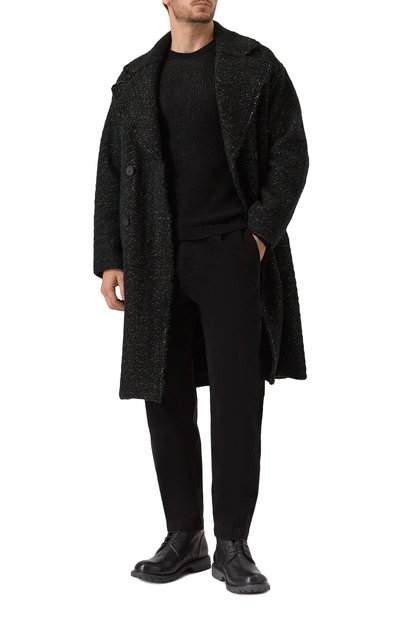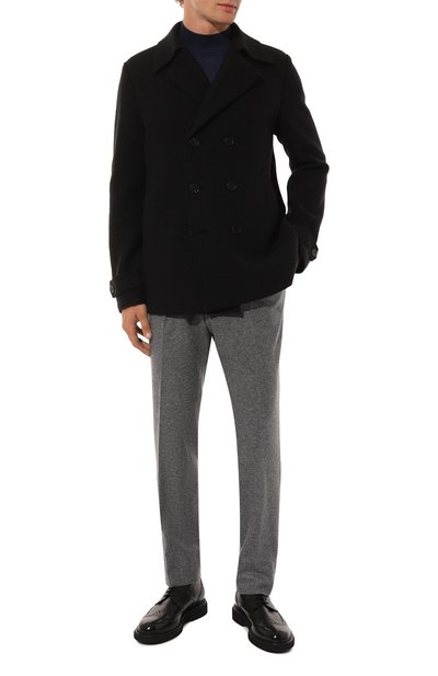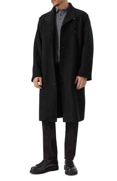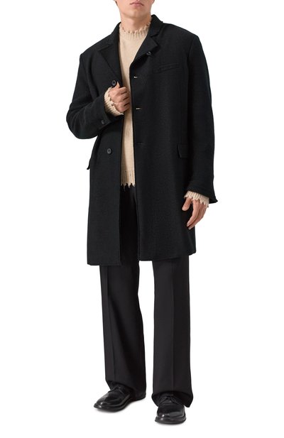 Полуприталенное двубортное пальто с застегивающимися наглухо широкими лацканами выполнили из шерстяной ткани. Спереди и по бокам модель с высокой шлицей дополнили врезными карманами.
