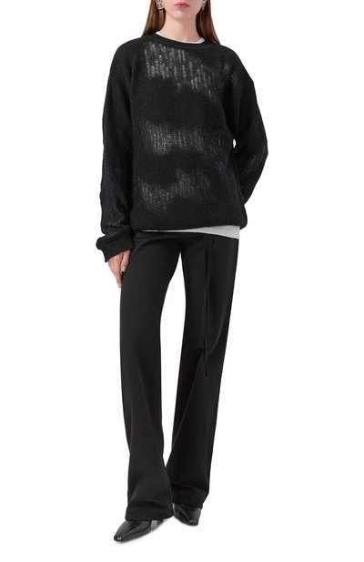 Укороченные джинсы с широкими защипами спереди выполнили из хлопка с добавлением кашемира и эластана. Выбеленные брюки с двумя боковыми и парой задних карманов украсили фирменным жакроном.