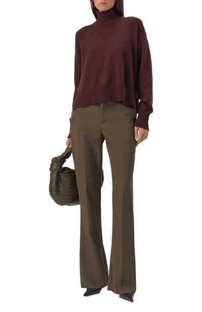 Свитер с рельефными линиями реглан и высокой горловиной в рубчик связали из чистого кашемира. Oversize-модель составит гармоничный дуэт с парной юбкой.