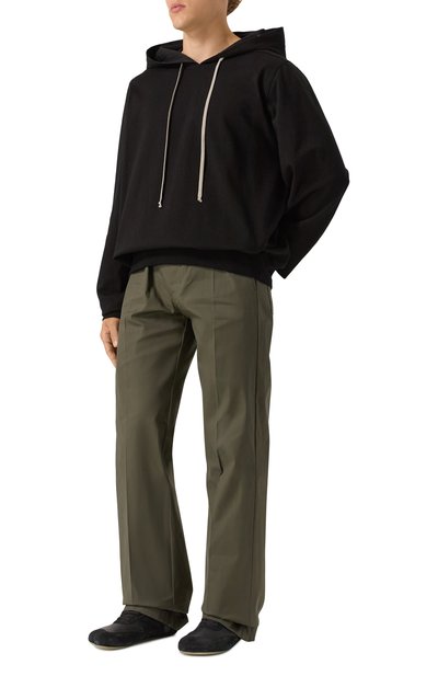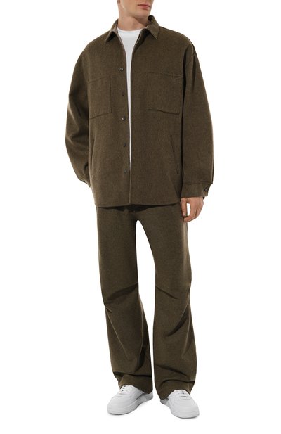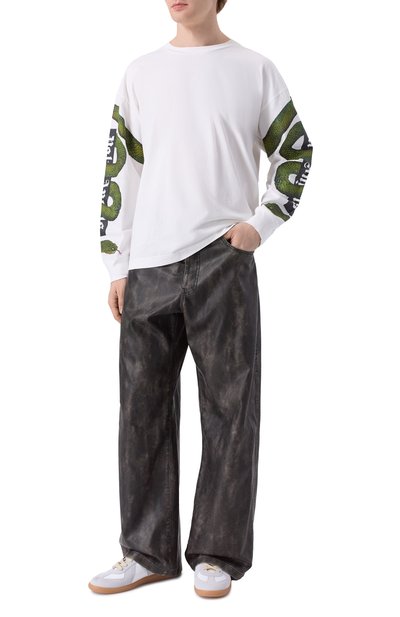 Широкие брюки с парными защипами спереди выполнили из японского флиса на основе хлопка с добавлением лиоцелла. Выбеленную модель дополнили боковыми и задними карманами.