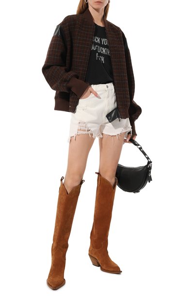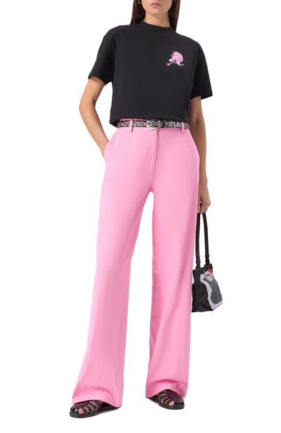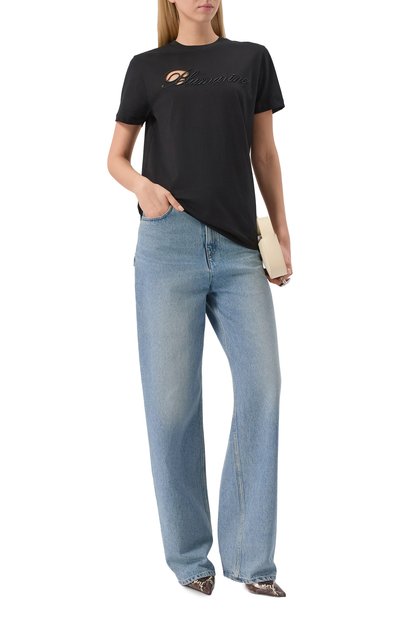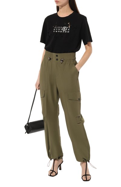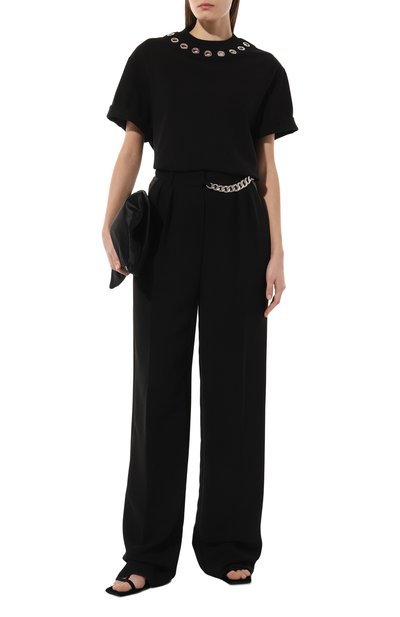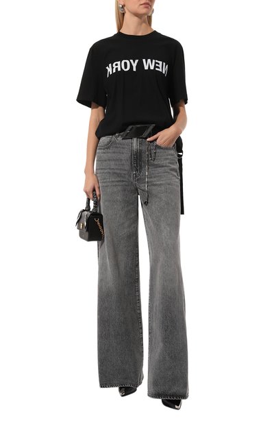 Свободную футболку со спущенной линией плеч выполнили из микса хлопка и кашемира. Спереди модель украсили декоративно состаренной надписью Not My Problem.
