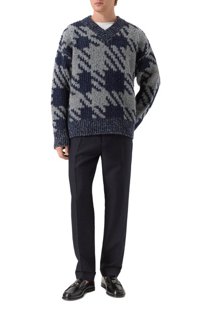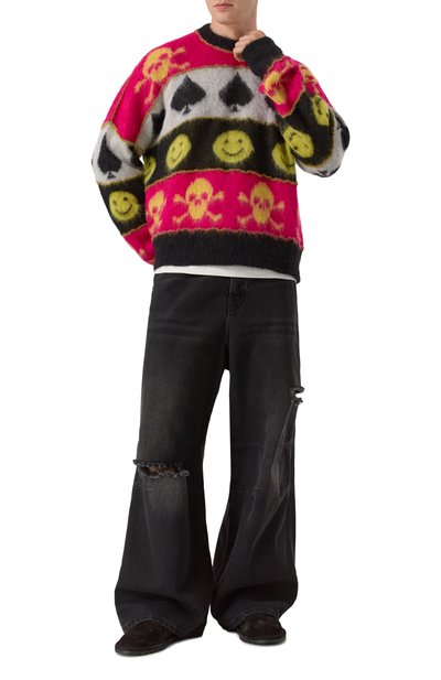 Свитер силуэта Relaxed fit связали из хлопковой пряжи с добавлением полиэстера. Модель с принтом в стиле милитари декорировали потертостями и спущенными петлями.