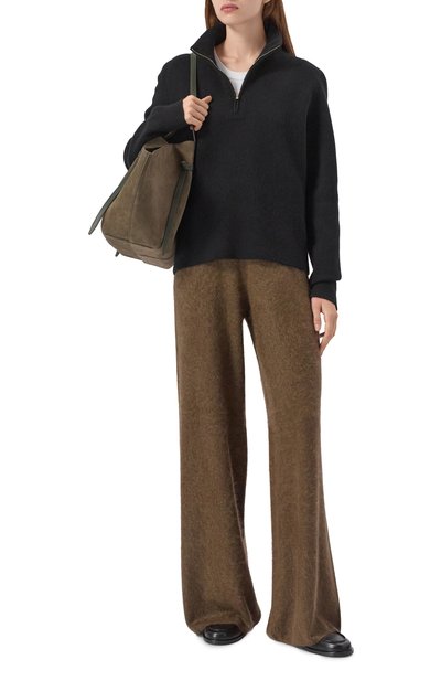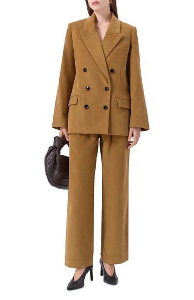 Брюки с высокой посадкой сшили из эластичного хлопкового вельвета. Пояс украсили фирменным патчем. Модель прямого кроя дополнили пятью карманами.